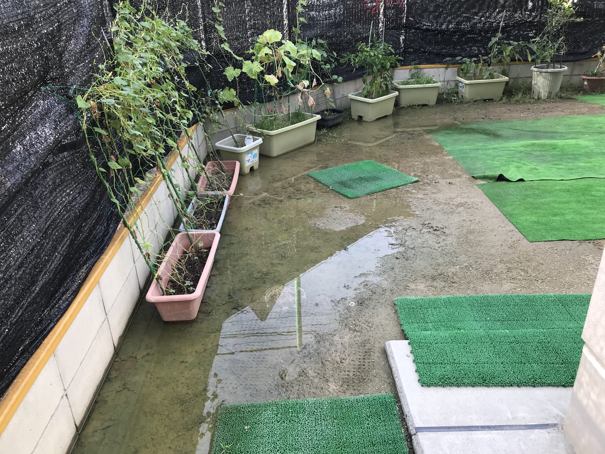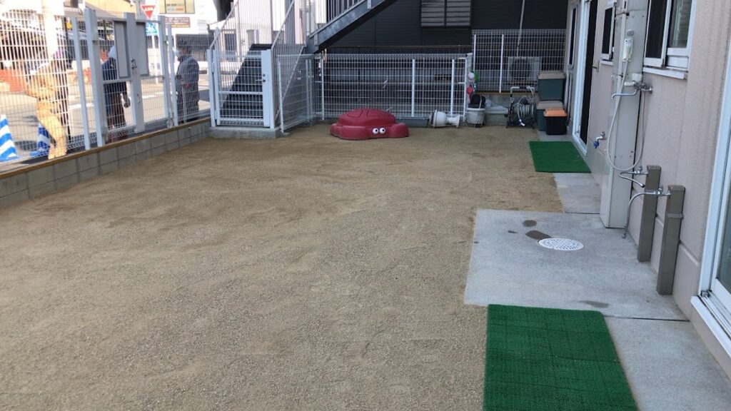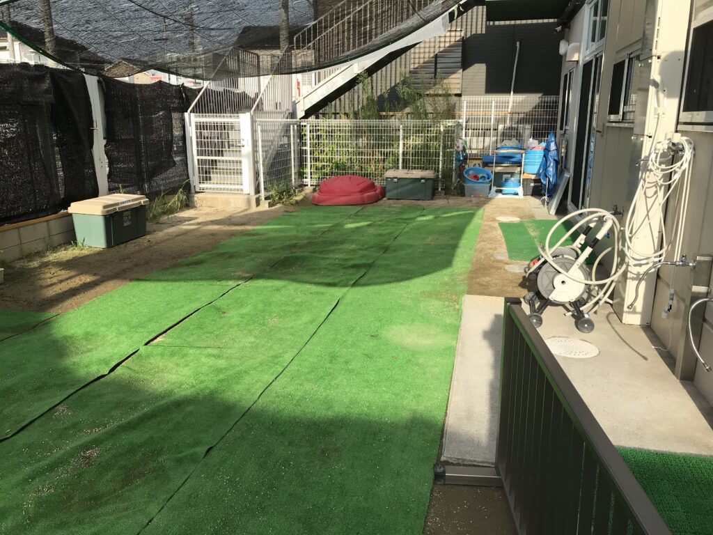 園庭盛土整備(水溜まり解消)〈保育園〉(名古屋市) 雨が降る度に園庭に水溜まりができてしまい、雨が上がった翌日も水溜まりが無くならず、園庭で数日遊ぶことができない状況でした。 園庭に水捌けのよい山砂を敷均し(均一な厚さと高さに平らに整え)、雨降り後の水捌けを良くして、水溜まりが出来ないように整備しました。 園庭で遊べない期間が短縮されて、子どもたちにも先生方にも喜んでいただけました。