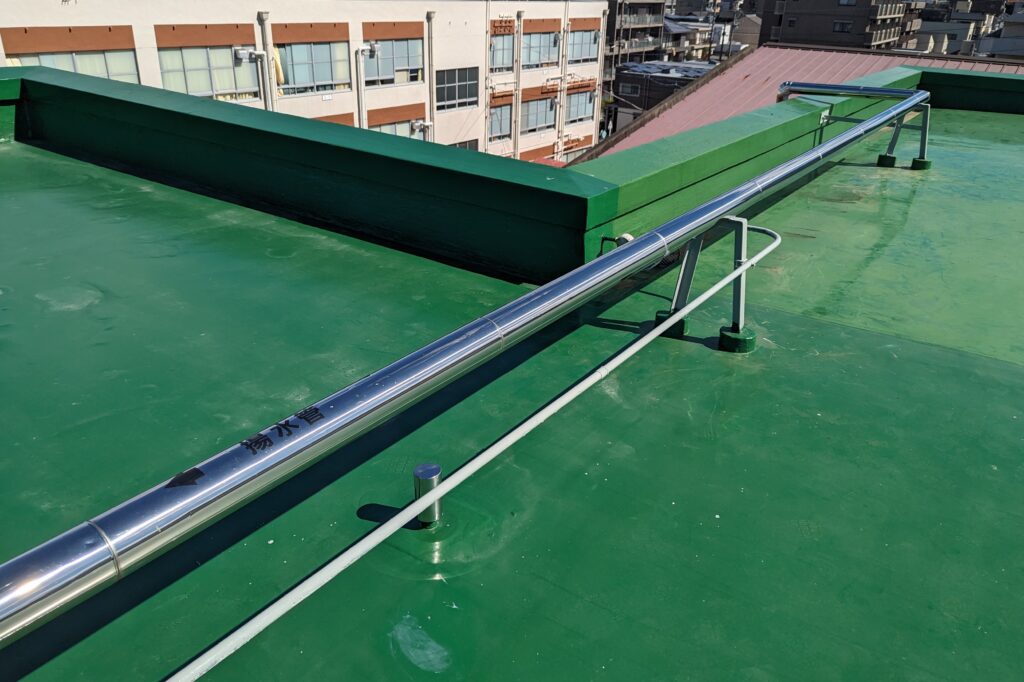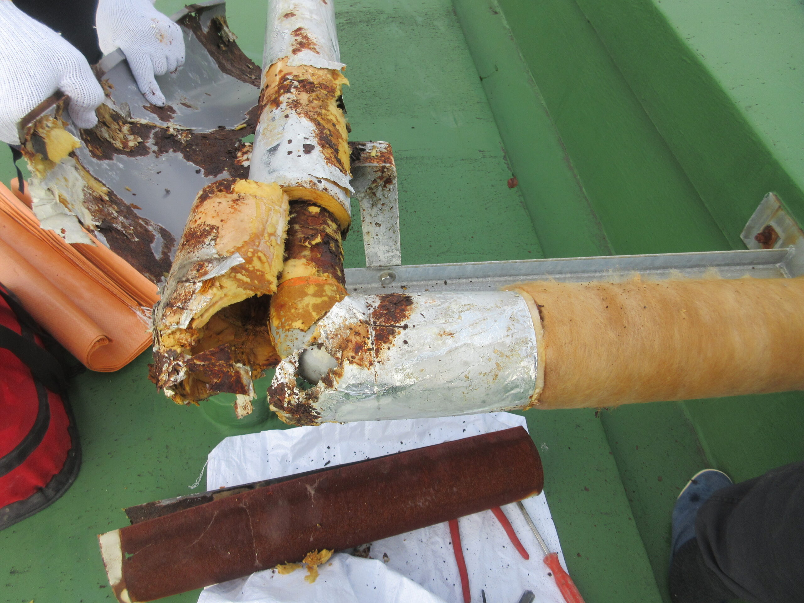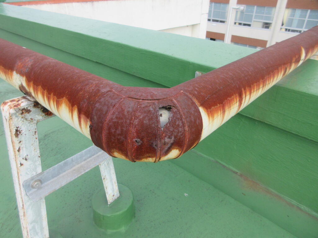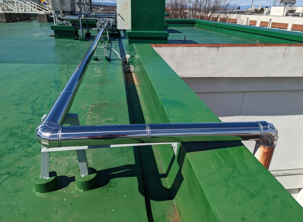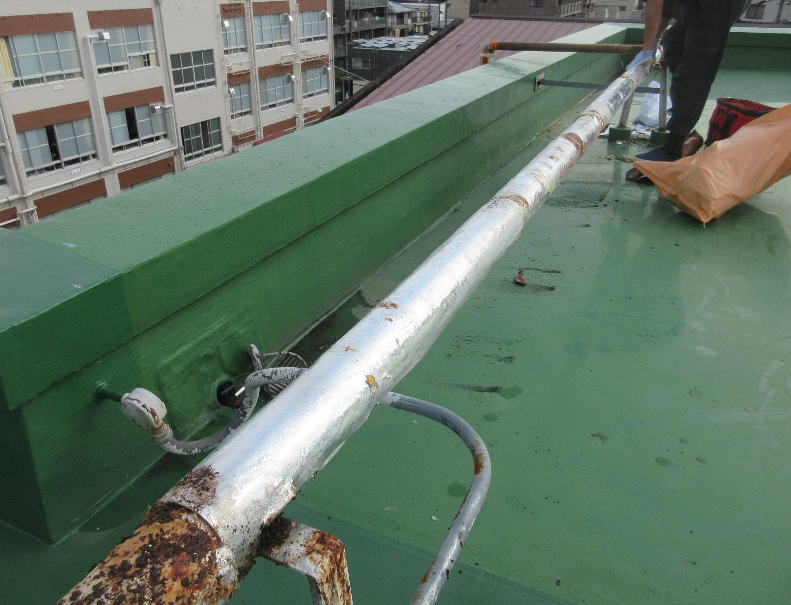校舎屋上ラッキングル交換工事(名古屋市) 既設ラッキング撤去 保温材巻付け 再ラッキング 校舎屋上のラッキングの経年劣化で錆びの発生や穴があいてしまい、 配管を守る本来の機能が失われてきていました。 既設ラッキング撤去・保温材巻付け・新しいラッキングを再施工。 ラッキング撤去 ラッキング撤去 ラッキング撤去完了 ラッキング再施工(保温材巻付け) 再ラッキング完了 再ラッキング完了 劣化したラッキングを撤去し新しいラッキングを再施工。工事が完了しました。 配管を外部の衝撃、雨風、紫外線などから守り、劣化を防ぐ事が出来るようになりました。 また、交換したことで配管周りがきれいになりました。